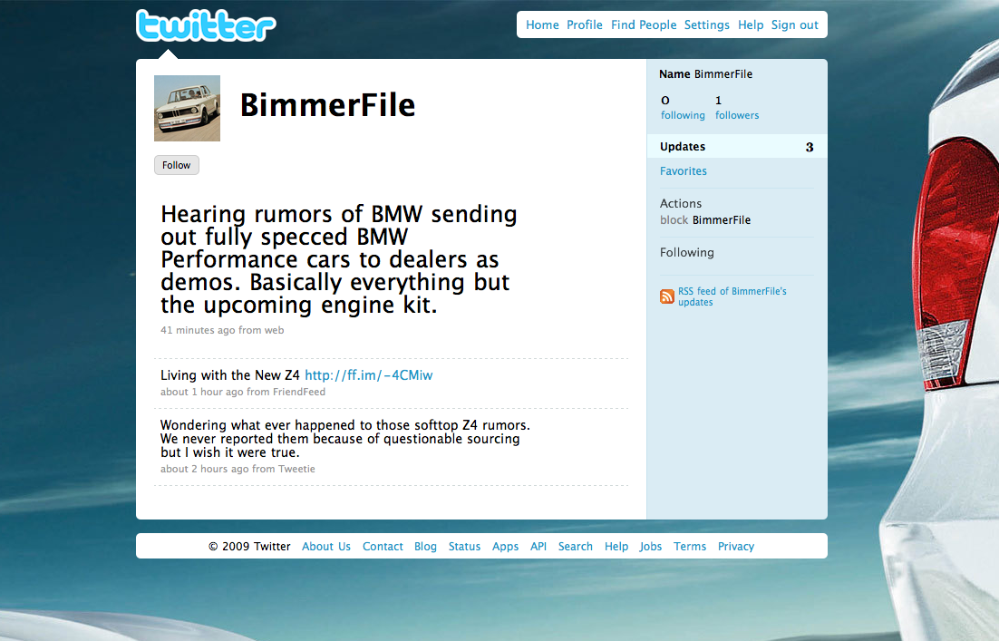 Site News BimmerFile on Twitter by Gabriel Bridger June 30, 2009July 6, 2009 BimmerFile is officially on Twitter as of today. Look for updates when stories post as well as rumors, opinions and generally things that we can ‘t quite mention on BF (for one reason or another). You can follow us at Twitter.com/bimmerfile FacebookTwitterPinterestLinkedinRedditMixEmail