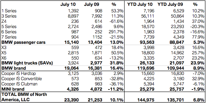 Official Release: The BMW Group in the U.S. (BMW and MINI combined) reported July sales of 23,390 vehicles, an increase of 10.1 percent from the 21,253 vehicles sold last year.Year-to-date, the BMW Group also reported a sales volume of 144,975 vehicles, up 6.8 percent from the 135,701 units sold last year.