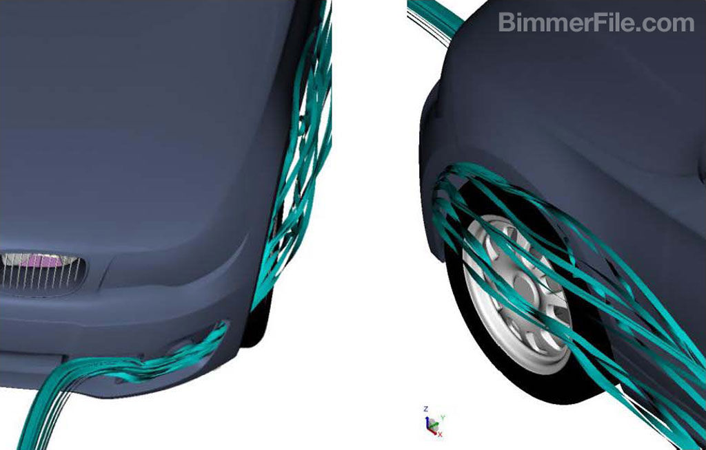 The air curtains improve air flow around the wheel arches with the benefit of significantly reduced turbulence. This feature consists of openings in the outer section of the lower front fascia that route high-pressure air through ducts at each front corner. The ducts are approximately 10 x 3 centimeters wide and are designed to channel air to openings at the front of each wheel arch, where it is discharged through a very narrow opening at high speed. The escaping air stream covers the side of the front wheels like a curtain, thereby reducing aerodynamically unfavorable turbulence around the rotating wheels.