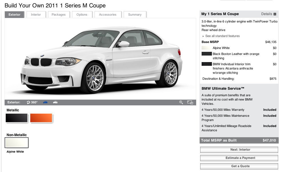 //1M BMWUSA Adds 1M to the Online Configurator by Staff March 9, 2011March 9, 2011 Gentlmen, start your clicking. However with most options unfortunately trapped in packages there ‘s not a lot of you-ification possible. Nevertheless, we ‘ll take ours in Alpine white please. FacebookTwitterPinterestLinkedinRedditMixEmail