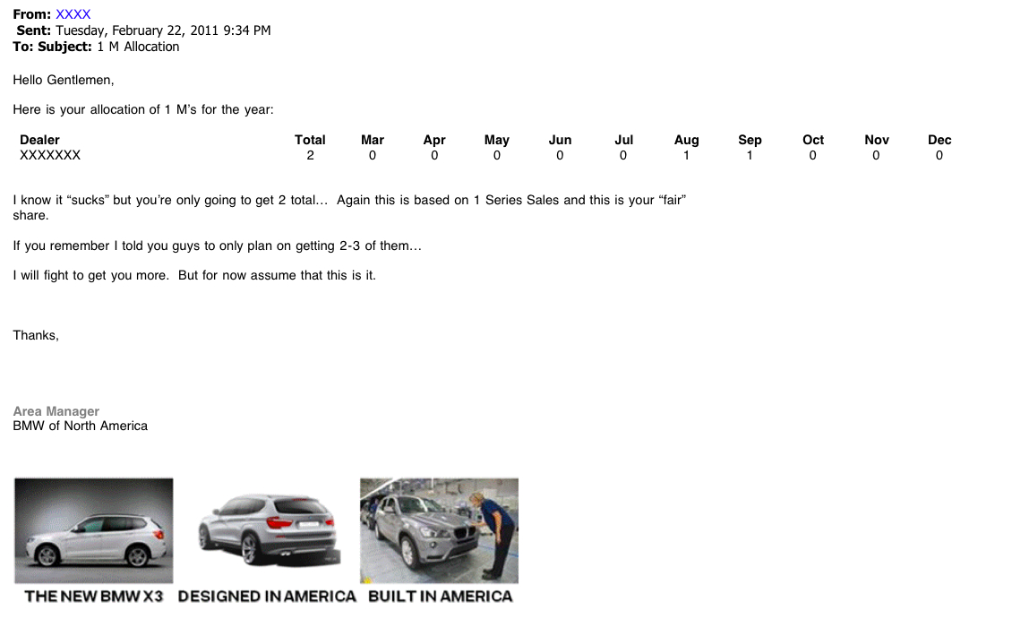 We have received many inquiries in regards to 1M allocations. So here is what we know based on conversations with several well placed sources. The truth is that area representatives for BMWNA know when each dealer will get their allocation (again- confirmed by multiple sources). As this screen shot of an email demonstrates, the area rep clearly tells the dealer WHEN and HOW MANY cars they will be getting. It doesn ‘t get more obvious and frank than this.