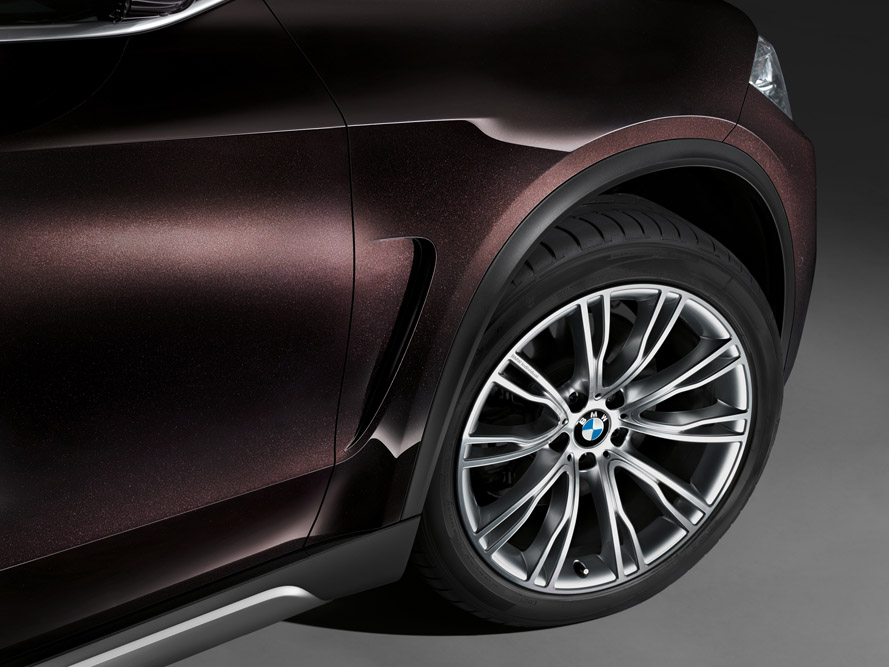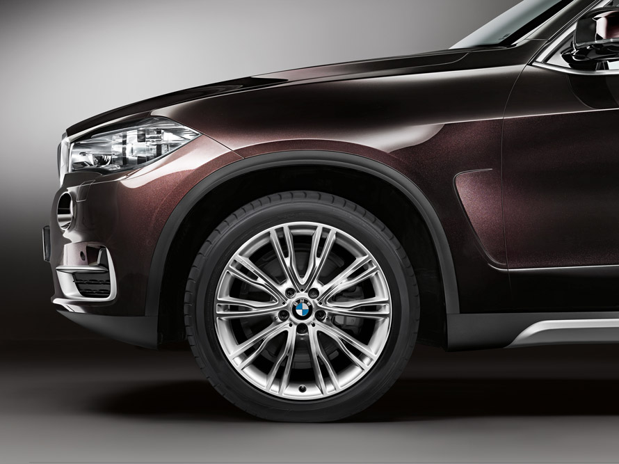 BMW Individual paintwork guarantees an impression of exclusivity at first glance. The application of up to seven layers of paint and the addition of special colour pigments make for intriguing iridescent effects, exceptional brilliance and unmatched depth. The BMW Individual finishes available for the new BMW X5 comprise the luxurious shades Ruby Black metallic and Pyrite Brown metallic. The intense lustre of these paintwork options derives from reflections triggered by red or gold pigments beneath the surface. Likewise adding an elegantly sporty touch to the exterior are the 20-inch BMW Individual light-alloy wheels in V-spoke design, fitted with mixed tires.