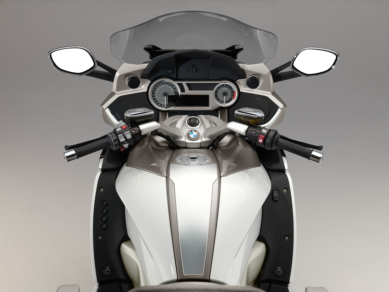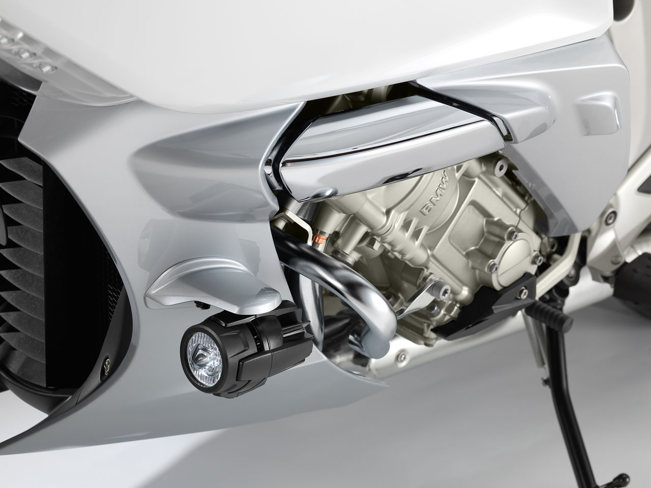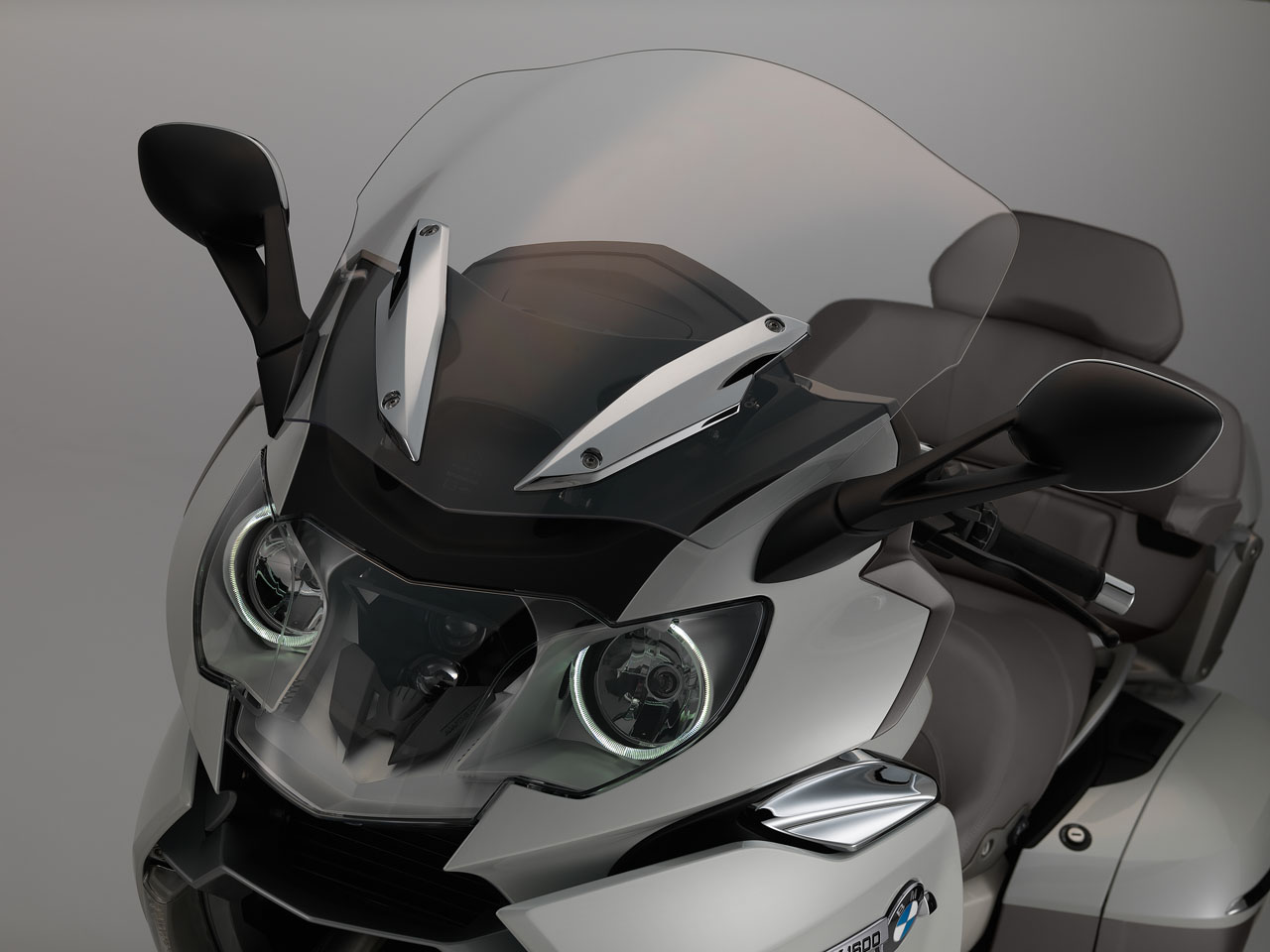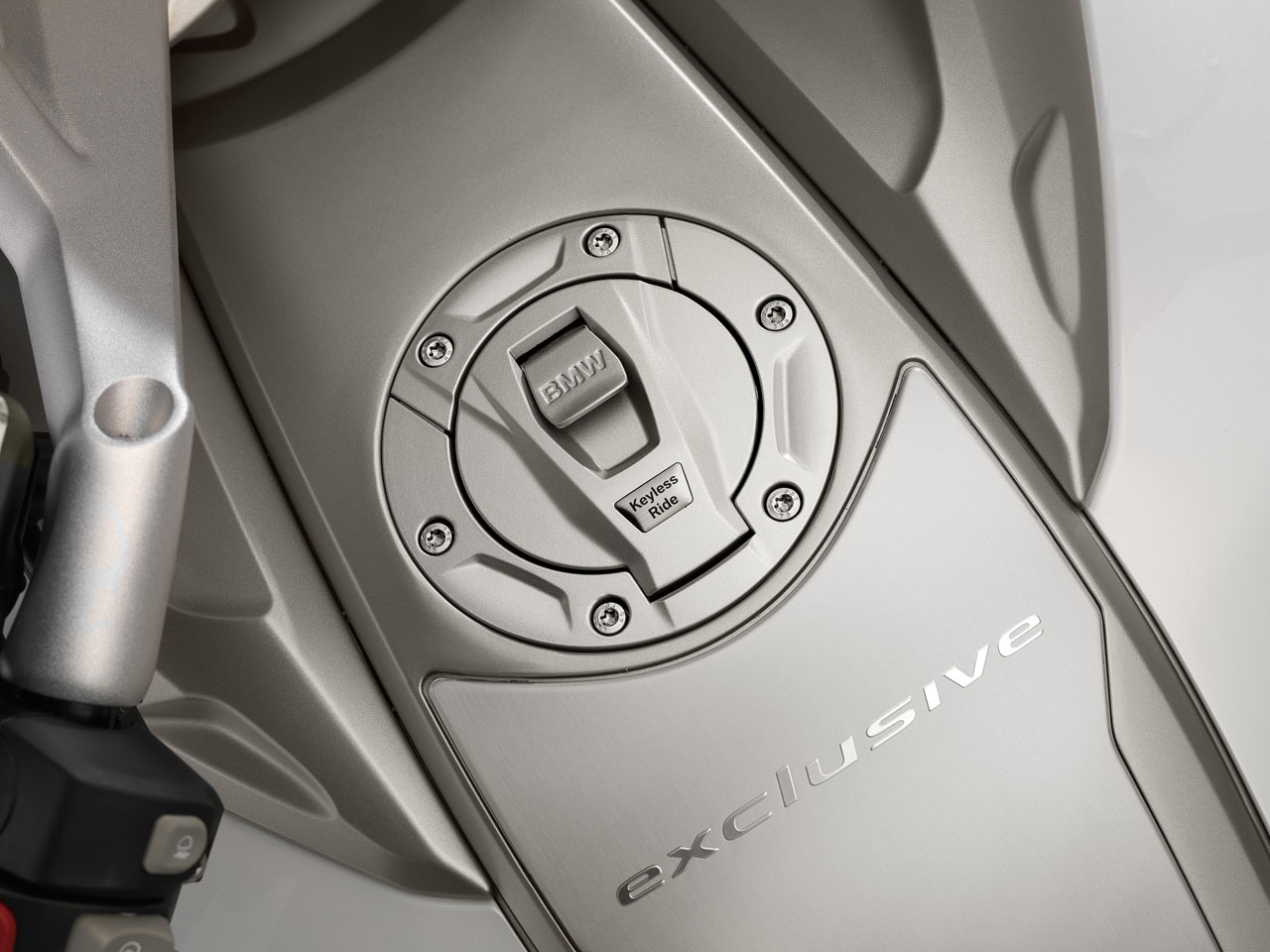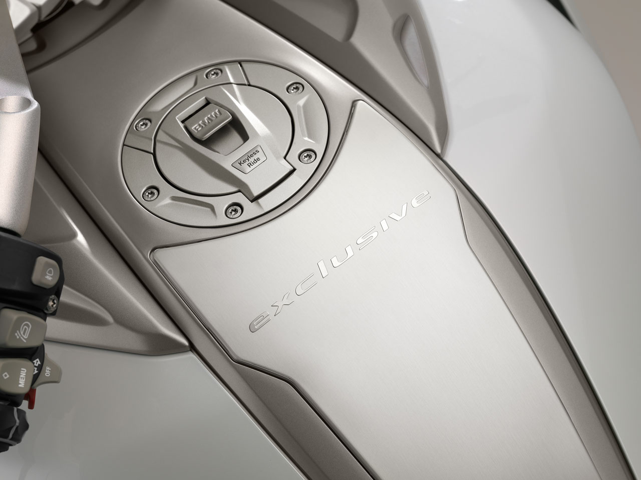The colour scheme for the new K 1600 GTL Exclusive adds to the sense of elegance and aesthetic appeal. The bodywork’s four-coat paint finish in Mineral white metallic high gloss combines to striking effect with the classy chrome surfaces, the contrasting shade of Magnesium metallic matt and the Glacier silver metallic radiator fins. The color-coordinated upholstery for the seat cushions, backrest and pillion passenger armrests adds the perfect finishing touch.