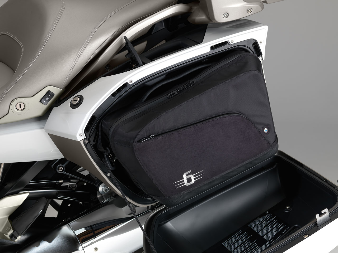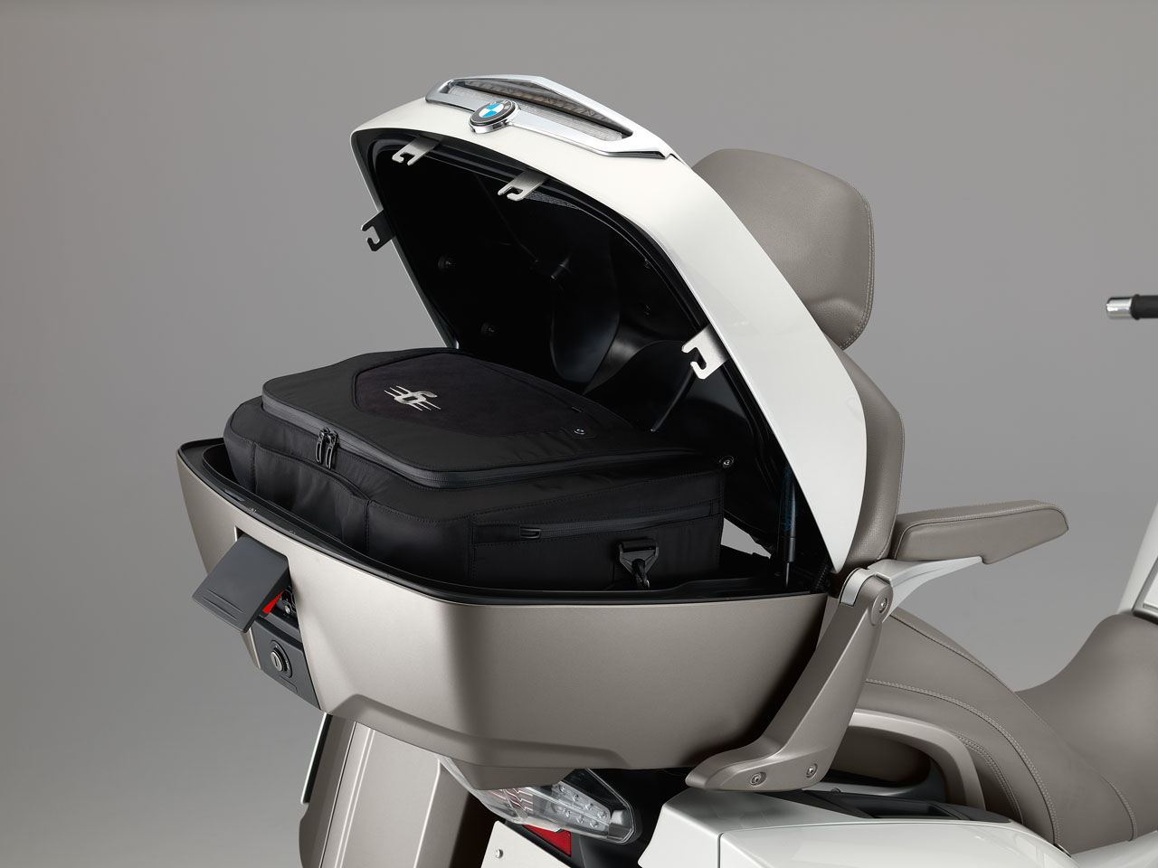 The film antenna for the radio that is embedded in the topcase lid is a world first and ensures the best possible reception quality while also enhancing the bike’s appearance. Long-distance travel comfort for the pillion passenger is taken to greater heights by a new seat, the heated backrest and comfortable armrests. Also to be found on the list of standard equipment are LED auxiliary headlights, adaptive xenon headlight, Tyre Pressure Monitor, additional brake light, engine protection bar, floor lighting, as well as LED daytime running light and, for the first time on a BMW motorcycle, Keyless Ride.