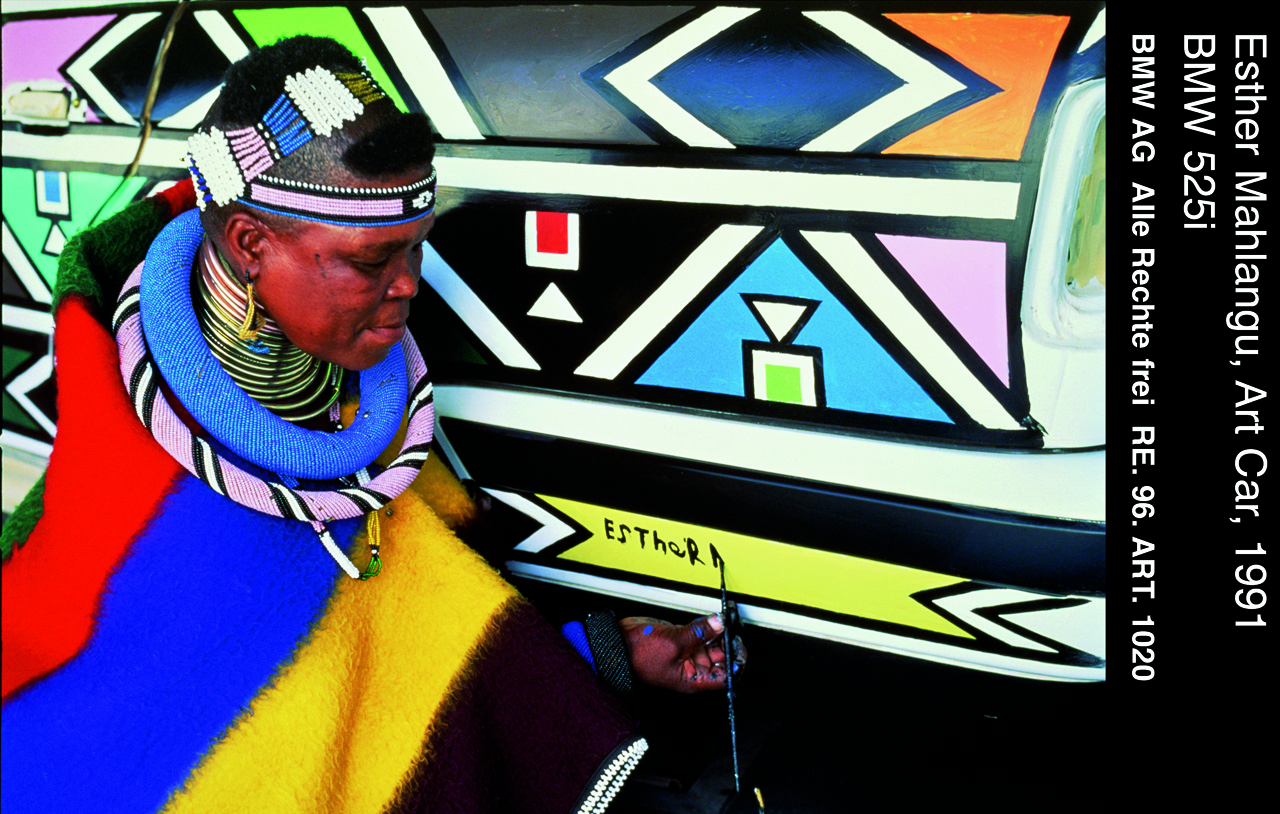 Since then 17 international artists have designed BMW models, among them some of the most renowned artists of our time: Alexander Calder (1975), Frank Stella (1976), Roy Lichtenstein (1977), Andy Warhol (1979), Ernst Fuchs (1982), Robert Rauschenberg (1986), Michael Jagamara Nelson (1989), Ken Done (1989), Matazo Kayama (1990), César Manrique (1990), A. R. Penck (1991), Esther Mahlangu (1991), Sandro Chia (1992), David Hockney (1995), Jenny Holzer (1999), Olafur Eliasson (2007), Jeff Koons (2010).