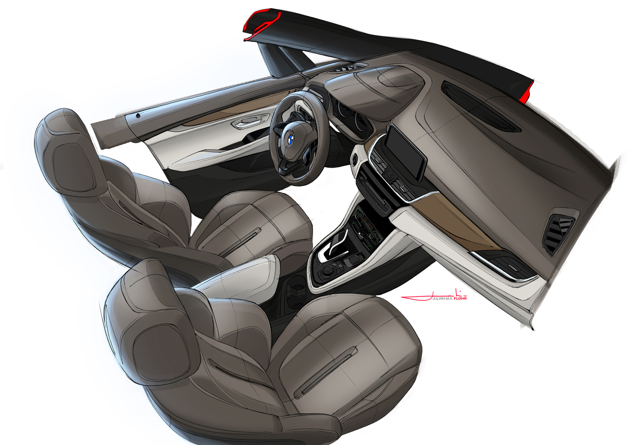 The brand identity with its overriding sense of dynamism is clearly present in the BMW 2 Series Active Tourer too. It shines through in trademark features such as the slightly forward-slanting BMW kidney grille at the front end flanked by the distinctive twin circular headlights. The short front overhang in particular is highly unusual for a front-wheel-drive car, and is just as much a classic BMW styling cue as the short overhang at the rear, the long wheelbase, the Hofmeister kink in the rear side windows and the L-shaped rear lights. Crisp contours and an eye-catching swage line at the sides give added impact to the wheel arches and inject the BMW 2 Series Active Tourer with forward thrust even when stationary. Moving inside, the controls for the radio, air conditioning and air vents are angled towards the driver in another unmistakable BMW design trait.