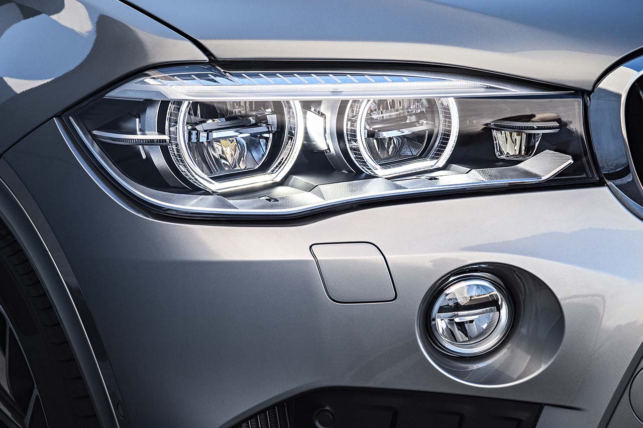 The shared front-end design of the BMW X5 M and BMW X6 M is likewise a clear departure from that of the respective standard models and follows the classic “form follows function” maxim. The large air intakes and voluminous “kidneys” of the radiator grille, with the now customary M double-bar look, are mandated by the high cooling air requirements of the powerful engine, transmission and high-performance front brakes. Despite the large amount of cooling and more stringent pedestrian protection requirements, the designers have managed to integrate foglamps into the front end of the vehicles. Both new M models borrow their headlights from the BMW X6, complete with headlight washer system. Elsewhere, the special flaps low down in the outer air intakes –adapted from those on racing vehicles – reduce lift and emphasise the optimized aerodynamics of the two new models.
