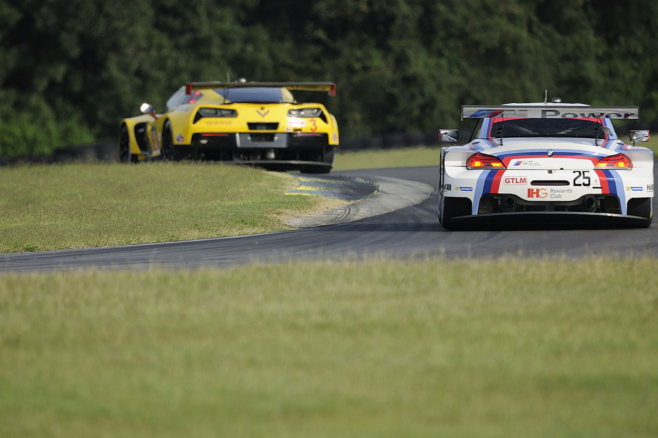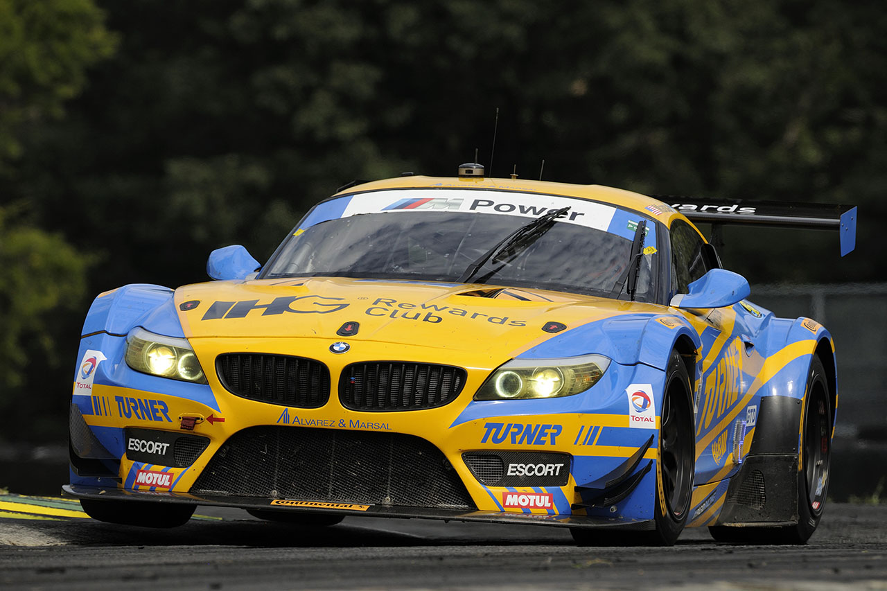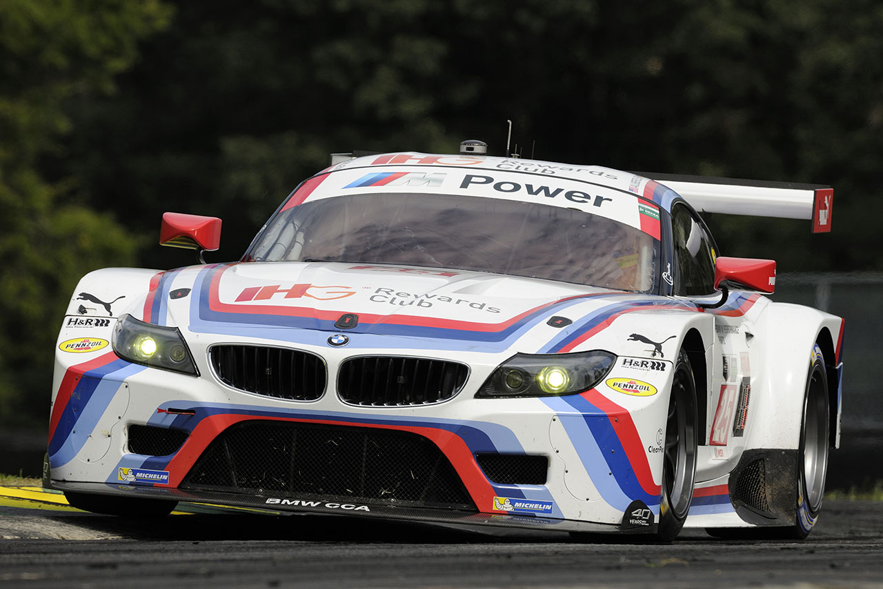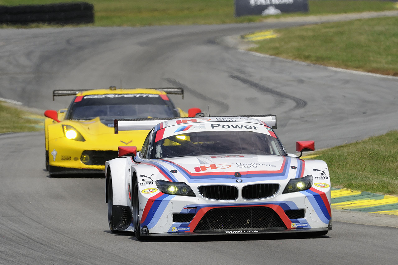 BMW Team RLL finished fourth and fifth in front of the large crowd that watched today’s two-hour-and-forty-minute TUDOR United SportsCar Championship Oak Tree Grand Prix at VIRginia International Raceway, in Alton, Va. John Edwards and Lucas Luhr, driving the No. 24 BMW Z4, finished fourth. Bill Auberlen and Dirk Werner finished fifth in the No. 25 machine. Both BMWs ended the race in the same positions from which they started. The race was won by the No. 911 Porsche.