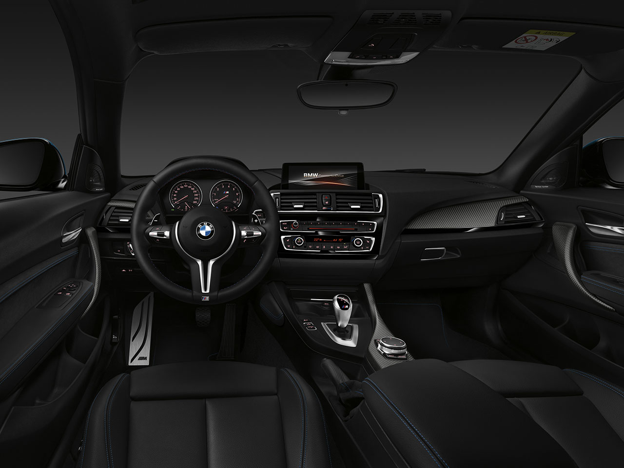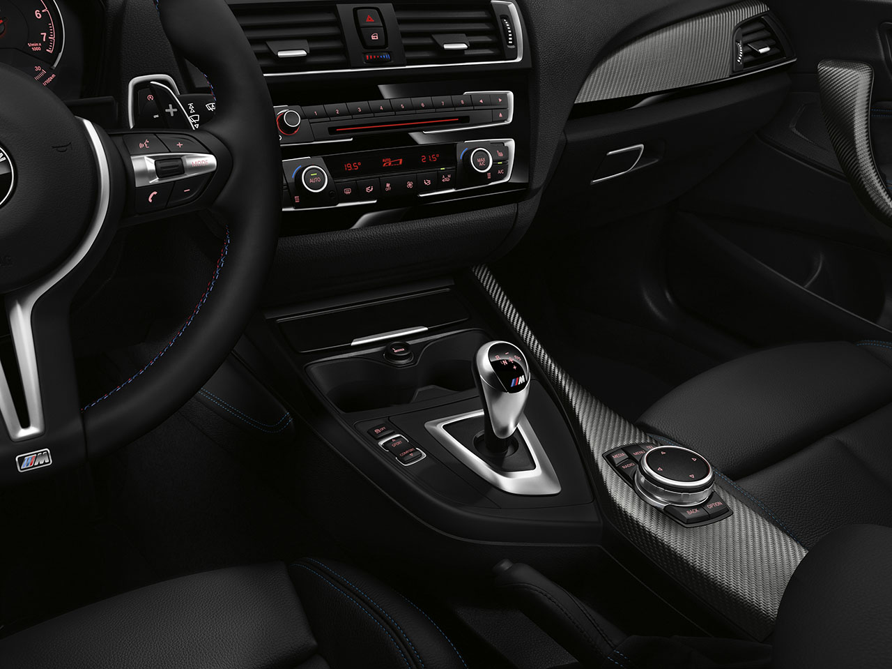Instruments with BMW M2-specific dials and needles, a speedometer scale reaching round to 200 mph and a tachometer reading up to 8,000 rpm provide an indication of the car’s extraordinary performance potential as soon as you climb aboard. Familiar M equipment items in the all-new BMW M2 also include M logos on the tachometer, gearshift lever, door sill plates and M leather steering wheel with shift paddles. Other highlights of the interior are the all-new BMW M2 trim strip with surfacing in open pore carbon fiber and Alcantara for the door panel inserts, parking brake boot and shift lever boot (manual transmission only).