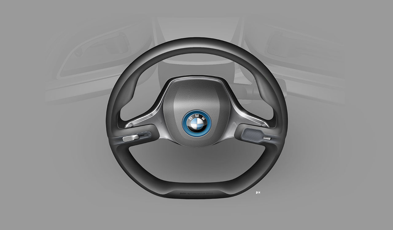 leather is also used on the dashboard, combined with a monofilament technical textile which also provides the floor covering for the BMW i Vision Future Interaction. Dark leather amido is combined with semi-aniline leather in Ice Grey to cover the central console. Buttons on the steering wheel made of polished aluminium emphasise the high-tech character of the BMW i Vision Future Interaction.