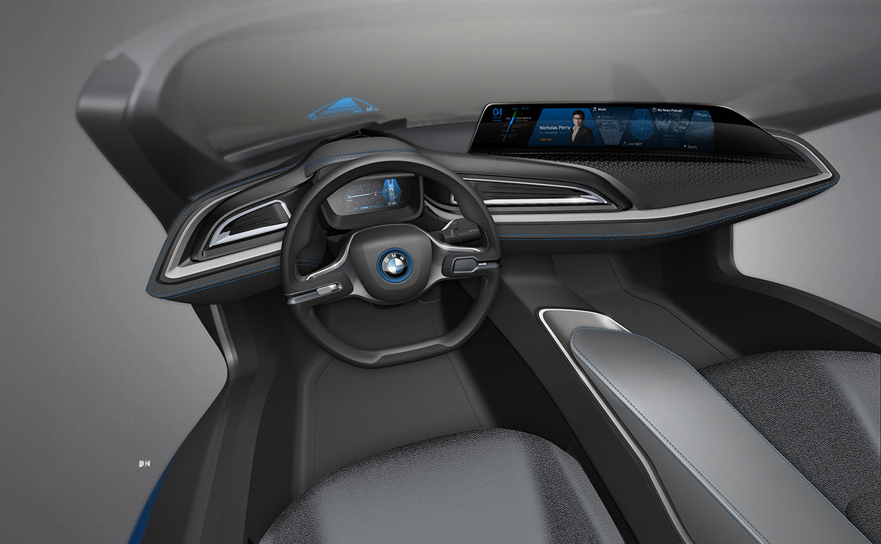 The BMW i Vision Future Interaction has a Head-Up Display, an instrument cluster with three-dimensional display, and a 21-inch panorama display which extends over almost the entire passenger side.