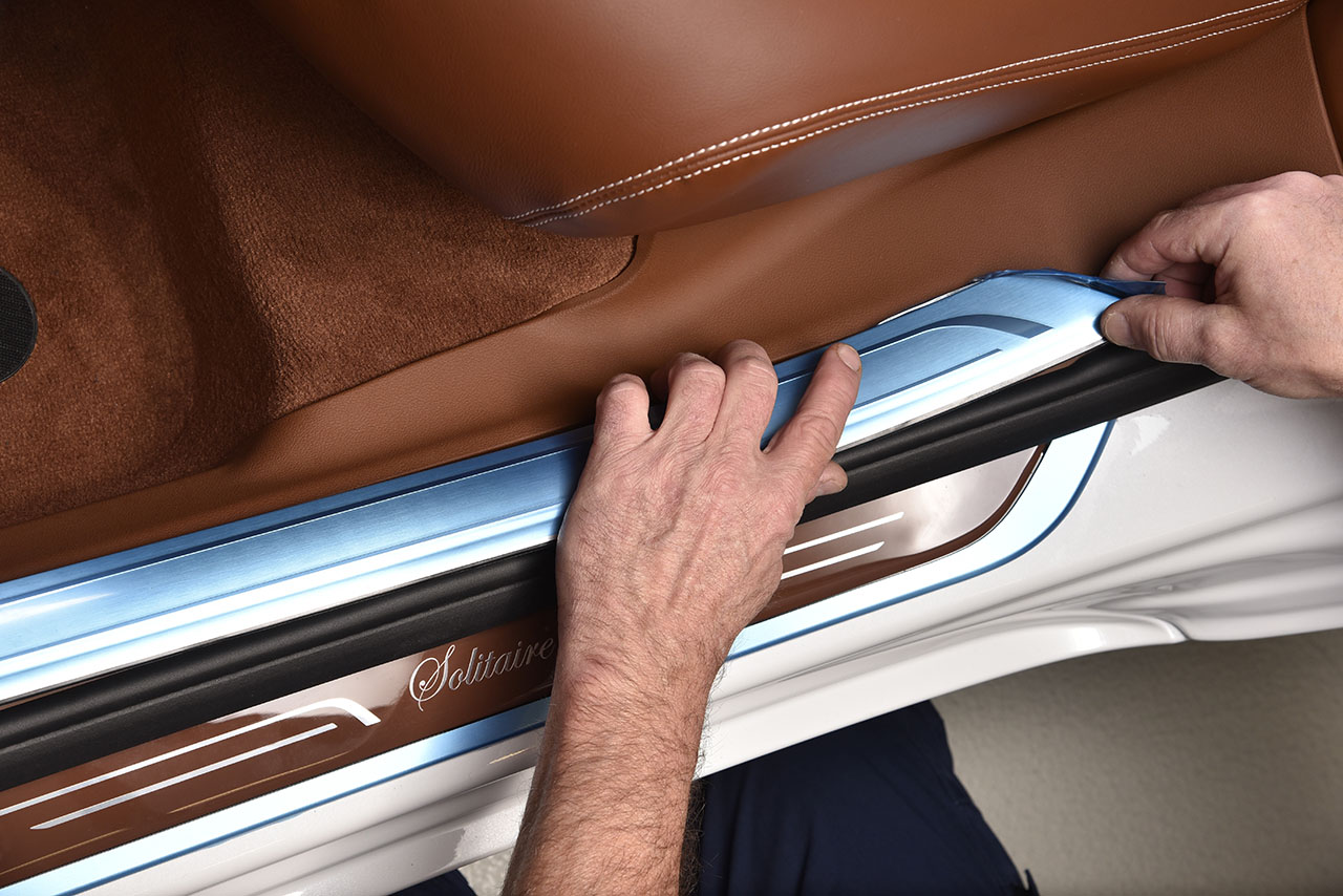 On the exterior, the two exclusive special colours, BMW Individual Metallic Black Gold and BMW Individual Metallic Solitaire White, underscore the expressive design language of the new BMW 7 Series. These colours can only be applied incorporating an extremely complex method, by which fine glass flakes are embedded into one of the final layers of paint, resulting in a particularly pronounced deep gloss. A chrome plaque located on the C pillar of all seven models and bearing the “Solitaire” lettering, as well as a decorative rear trim sporting the name of the edition, provide discreet indication of the vehicle’s uniqueness.