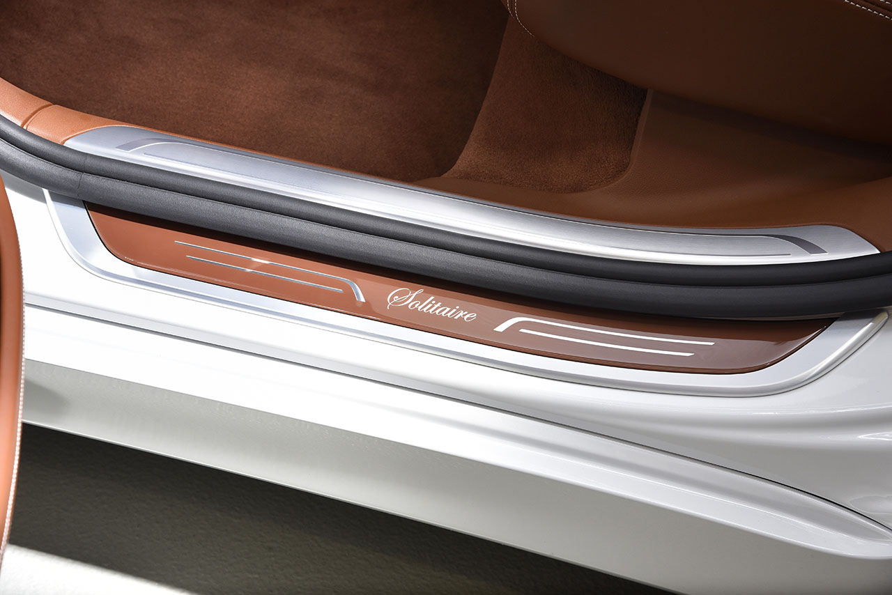 Inside the car, i.e. where comfort is experienced first hand by the customer, a large number of exclusive features emphasise the aesthetics, luxury and elegance of these edition models. The exclusive BMW Individual fine-grain full leather trim Merino in the colour Tartufo as well as the Alcantara roof liner in the same colour contribute considerably towards the vehicle’s ambience. Extremely soft floor mats made from sheared lambskin in Tartufo, storage compartments for cosmetic tissues finished in colour-matching leather in both rear doors as well as soft, Alcantara covered cushions in the colour Tartufo bearing the embroidered lettering “Solitaire” or “Master Class” respectively all enhance the luxurious character of the BMW 750Li xDrive. A bar compartment with tulip sparkling wine glasses and an integrated cooling box in the rear compartment centre console are available for refreshments, whilst a silver-plated plaque on the centre console discreetly informs passengers that they are travelling in a highly exclusive edition model that has been produced only seven times. However, the highlight of these special edition models are undoubtedly the five optional diamond inserts in the interior trims on the dashboard and doors.
