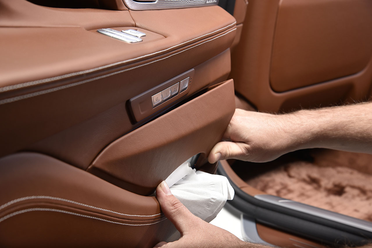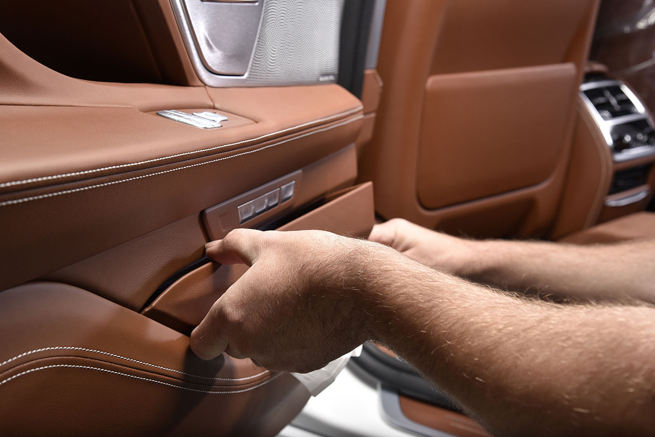 Seats belong to the few elements of a car with which the occupants are in permanent contact during a journey. Consequently, they contribute considerably towards a feeling of relaxation and to travel comfort. The car features exclusively BMW Individual fine-grain Merino, which is the highest quality leather available for a BMW. Naturally supple and finely structured, the leather pleases with a unique look and feel. This special leather reflects the character of BMW Individual – the choice of best materials and top quality workmanship meet the highest demands. Only flawless, intact hides are used for further refinement. Two processing methods are applied – a special re-tanning process and vacuum drying, which are normally only used for the manufacture of particularly high-grade leather accessories. They lend BMW Individual fine-grain Merino leather its unparalleled elegance and unique sheen. However, thanks to careful processing, the natural quality of the original material remains unaffected; it is extremely durable and breathable, but at the same time very evenly structured and soft, providing the highest degree of sitting comfort. However, BMW Individual not only sets standards in the new BMW 7 Series with the quality of this exceptionally high-class leather, but also with further optional features for the leather trim. In addition to the back panel cladding for the seats, the upper and lower instrument panels as well as the door panels, including the B pillars, are covered with BMW Individual fine-grain Merino leather.