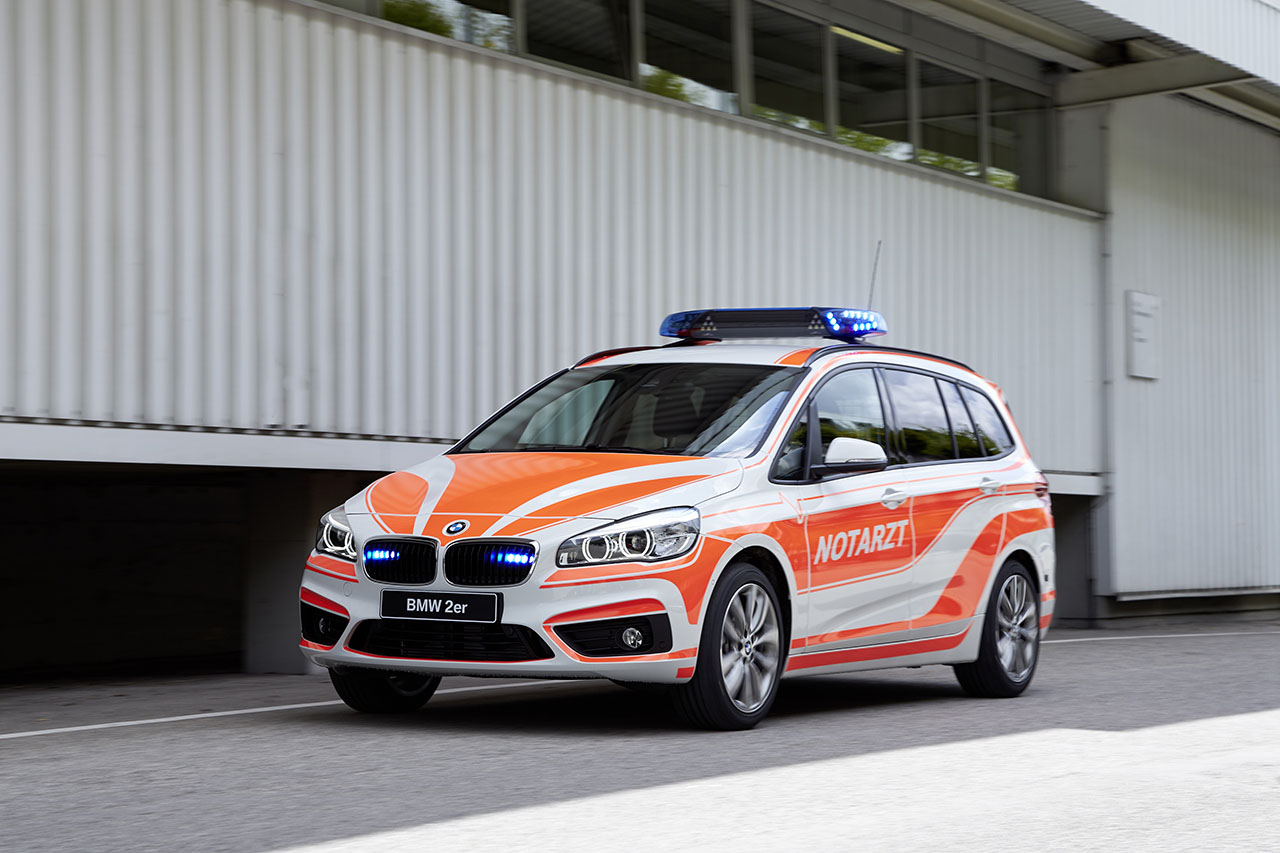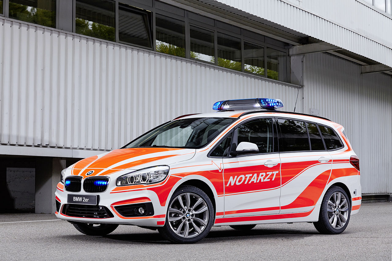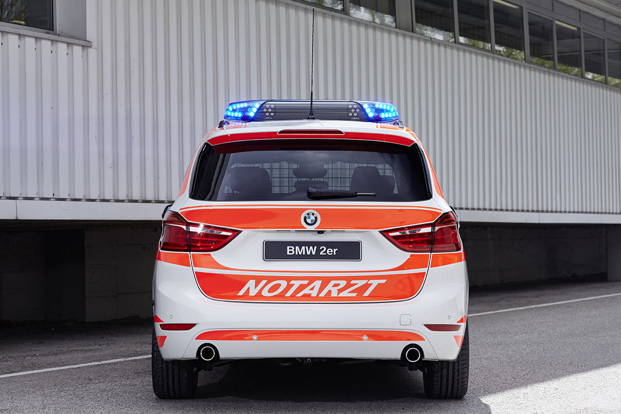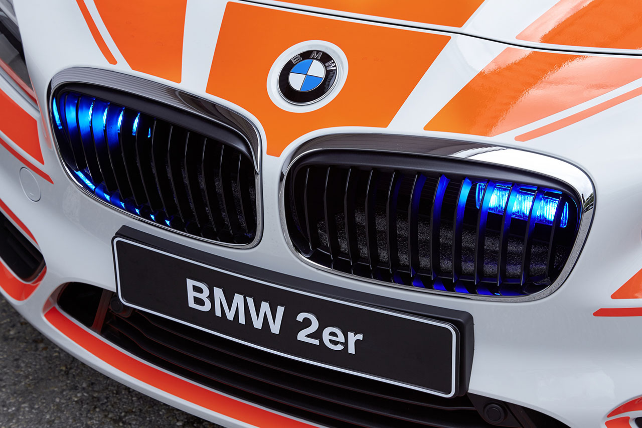 With the BMW 2 Series Gran Tourer, BMW has developed a unique series combining an excellent use of space with the dynamic driving experience that is so characteristic of BMW. The BMW 2 Series Gran Tourer on display has been designed as a vehicle for emergency physicians. The appropriate foiling indicates the specific purpose of the vehicle. The two blue LED front flashers behind the radiator grille and the two blue LED flashers in the tailgate can be activated when on a trip covered by special rights for rescue operations. The multi-purpose roof antenna (4 m), which can be used to receive GPS (Global Positioning System) signals as well as for the TETRA digital trunked radio, is connected to the preparations for installing the AEG TX9 system and Sepura digital radio. An additional battery with a capacity of 70 ampere-hours (Ah) ensures the continuing functional availability of all onboard electrical and electronic equipment in the field, even when the engine is switched off. Chargers for both vehicle batteries charge the power storage system back up again comfortably during operational deployment. In addition to an accident data recorder, an additional LED light in the luggage compartment and a steel partition grille behind the rear seats complete the list of equipment fitted to this BMW emergency physician vehicle.
