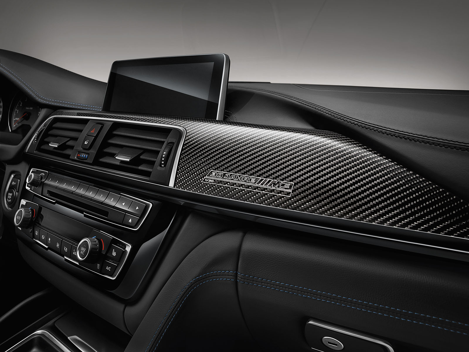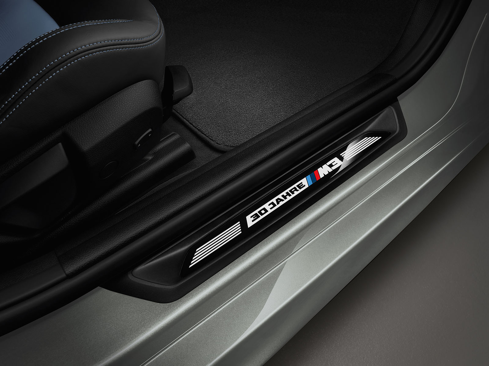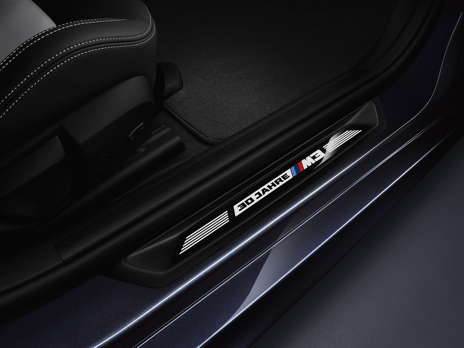 The logo “30 Years M3” on the front doorsills reminds both driver and front passenger of the BMW M company icon’s unique history. The wording “30 Years M3 1/500” on the carbon fibre interior trim strip of the instrument panel gives indication of the exclusiveness of the BMW M3 “30 Years M3”, which is limited to 500 cars worldwide. “30 Years M3” is embroidered into the front headrests.