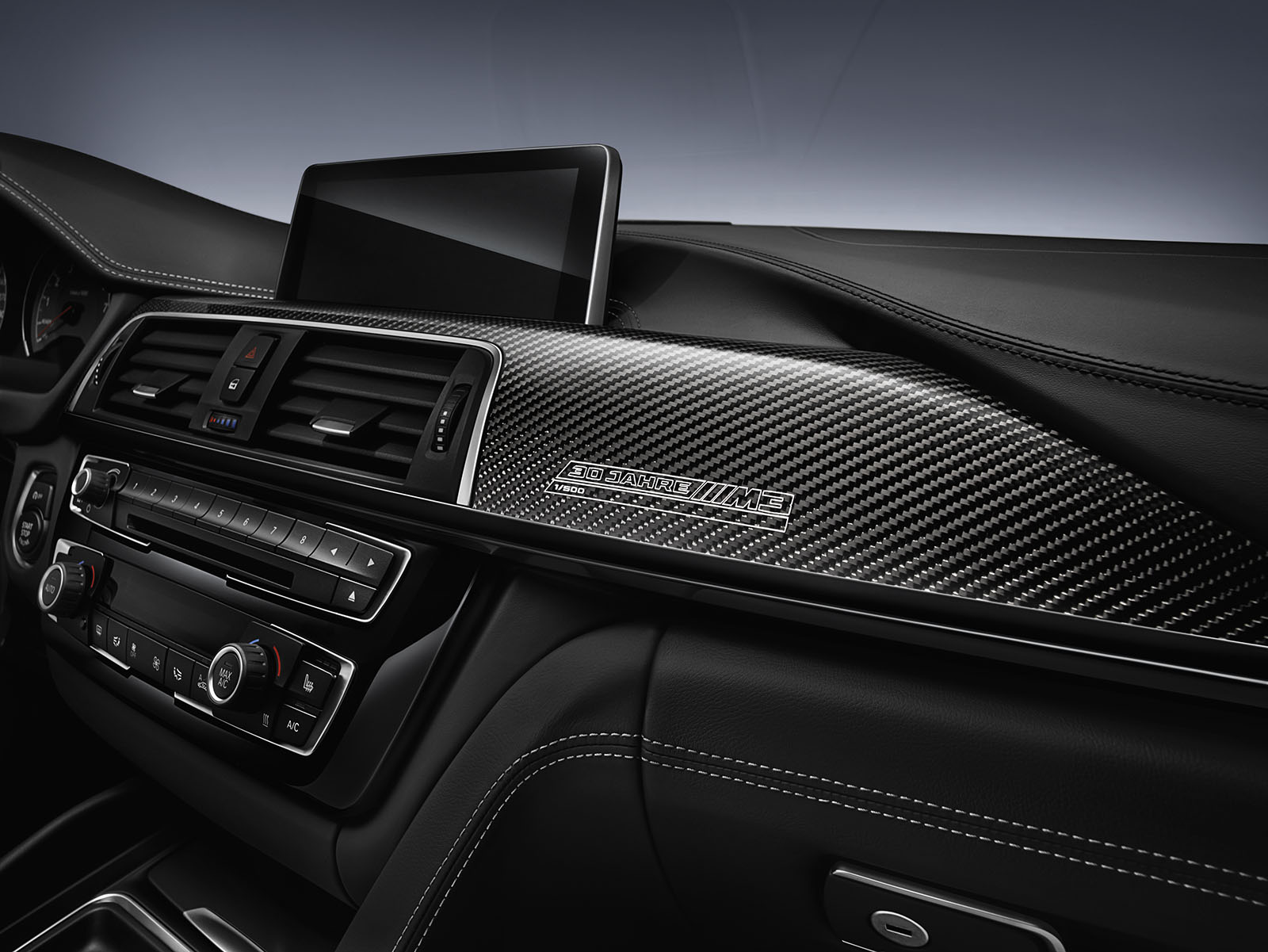 Highlighting the unique and limited production, special “30 Jahre M3” logos embellish the interior. Exclusively designed M gills bear the logo as well as the doorsill finishers, interior trim finishers in carbon fiber with Black Chrome accents and the embroidered front headrests. Additionally, M sports seats with woven-in BMW M stripes enhance the sporty interior ambience.