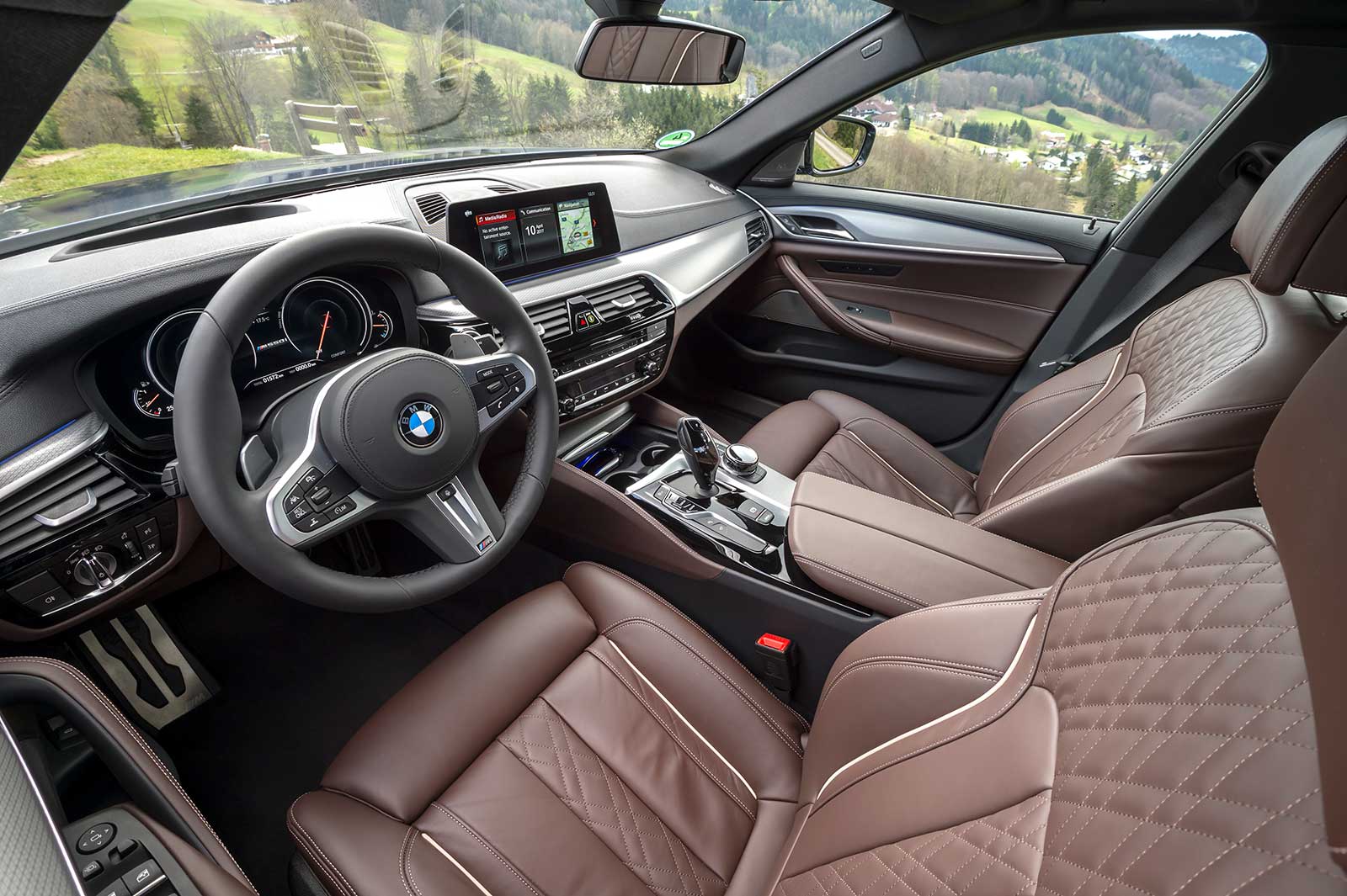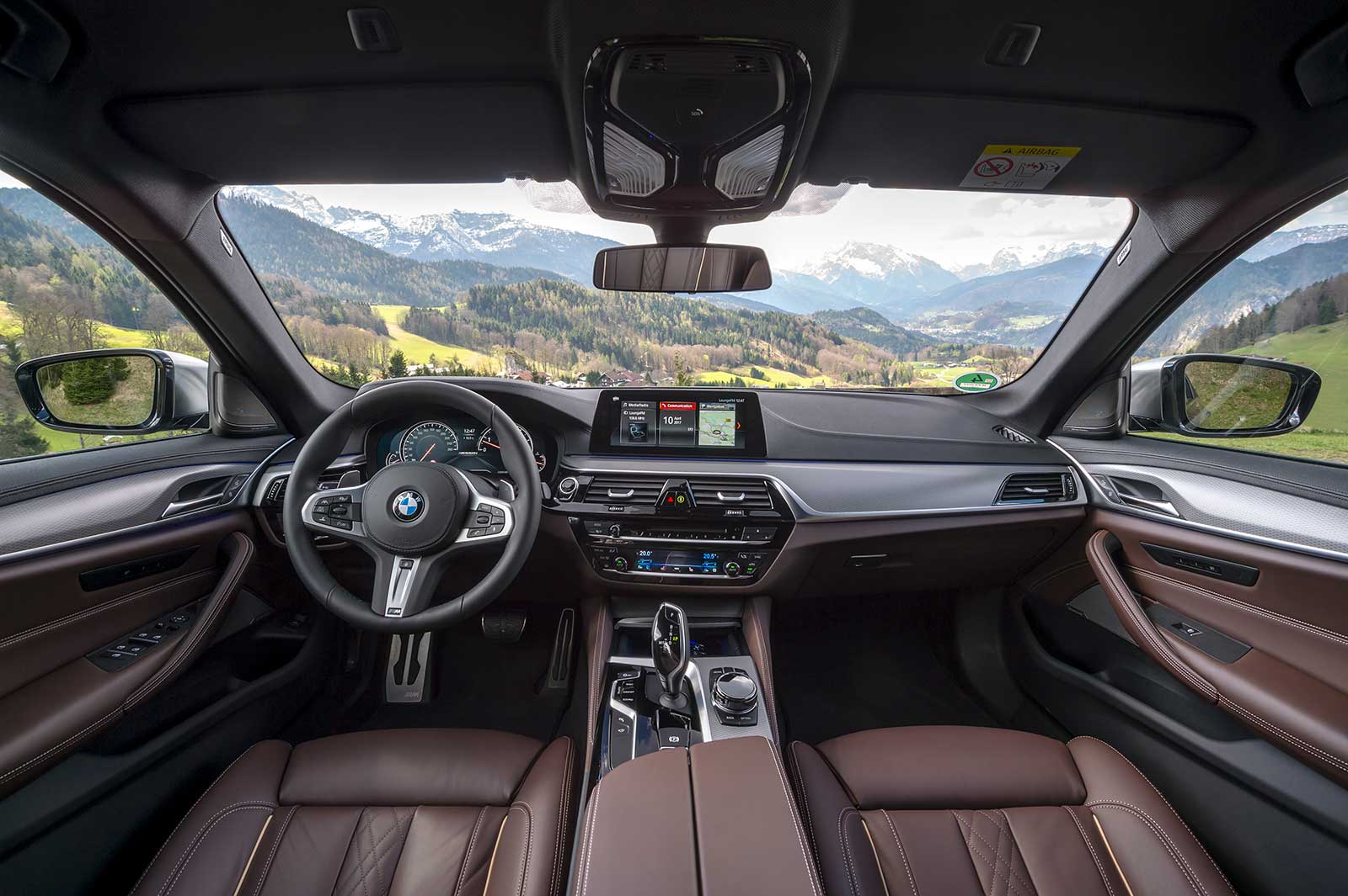Illuminated door sills bearing the inscription “M550i xDrive” beckon passengers into the interior, where M sports seats upholstered in Black Dakota leather with blue contrast stitching, the latest version of the M sports steering wheel, M design floor mats and special interior trim strips and pedals made from aluminium combine to create the aura of sporting exclusivity that is a hallmark of all BMW M Performance Automobiles.