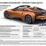 Official release: Today, the allure of sustainable driving is poised to enter another new dimension as BMW introduced the first-ever BMW i8 Roadster matching BMW eDrive technology with the Ultimate Driving Machine. The first-ever BMW i8 Roadster takes the BMW i8’s combination of locally emission-free mobility, high-caliber performance and adds the top- down driving experience. The Roadster offers a whole new sensation of freedom, opening the door to virtually silent driving with zero CO2 emissions and bringing an extra edge of purity to open-air driving. An optimized BMW eDrive technology means more power – total output increased to 369 hp (+12 hp), a refined high-voltage battery with increased capacity and range, the first-ever BMW i8 Roadster and BMW i8 Coupe can cover up to 18 miles (preliminary) in purely electric driving. With hybrid-specific all-wheel drive, combustion engine driving the rear wheels and the electric motor driving the front wheels, acceleration 0 to 60 mph takes just 4.2/4.4 seconds (preliminary) Coupe and Roadster respectively with both reaching an electronically limited top speed of 155 mph.