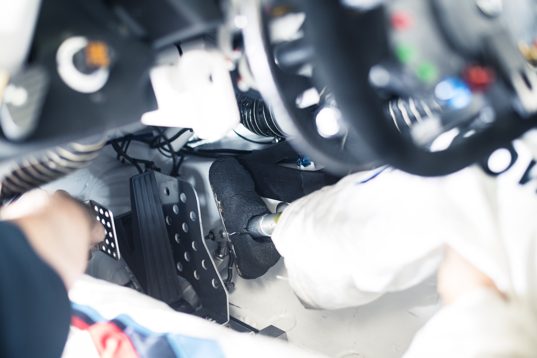 BMW Z4 GT3 – 24h Spa (2015): New, very thin brake pedal added to the pedal box and inserted into the prosthetic leg like a pin; steering wheel with ring for accelerating; gears changed using shift paddles on steering wheel; clutch-by-wire system with clutch paddles
