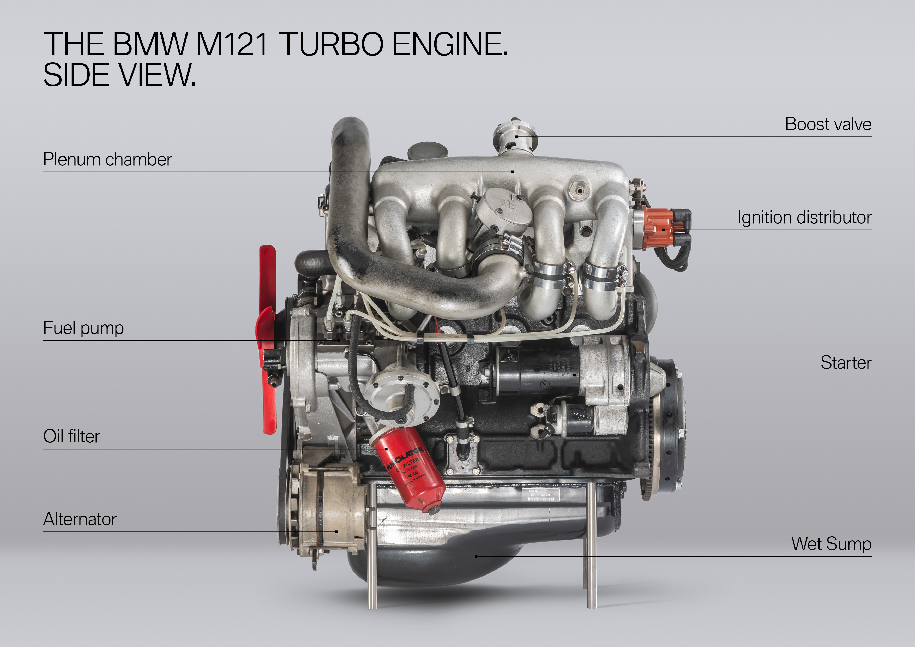 Despite the 50 years that lie between them, the two high-performance engines have a number of similarities: both are straight, four-cylinder engines with a two-litre capacity and a turbo charger. In both the BMW M121 and the P48, the sensitive engine components must be protected by a heat shield from the heat emitted by the turbo charger. A mechanical injection pump supplies the engine with fuel in both cases.